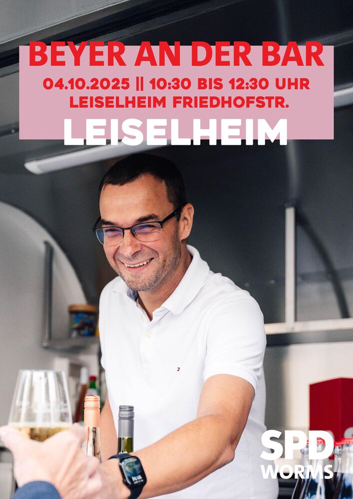 "Beyer an der Bar" kommt auch zu euch! MdL Dirk Beyer macht Halt in unserem Stadtteil mit kühlen Getränken und offenen Ohren für eure Themen. Mit dabei: Weine aus Leiselheim, alkohlfreie Drinks, Kaffee und das Beyer Bier Orignal Hell.